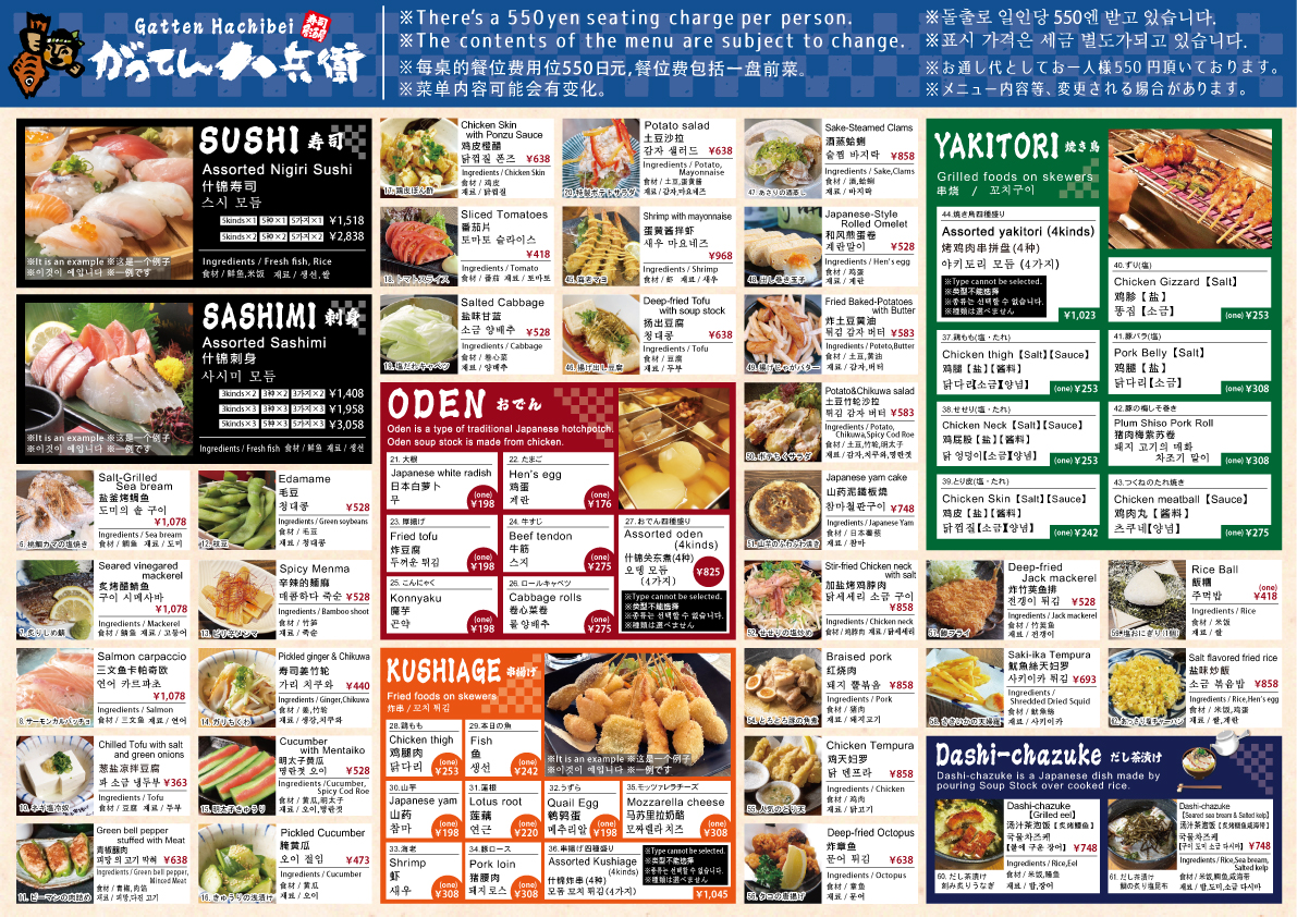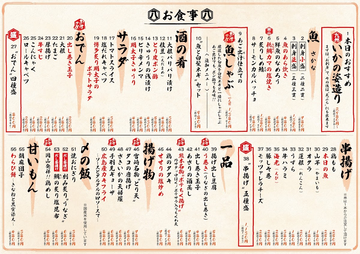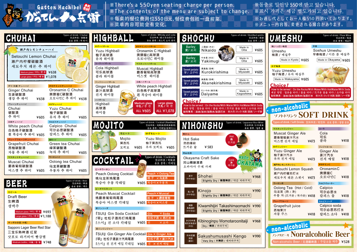The menu at Seafood Izakaya Gatten Hachibe offers a delightful variety of dishes that showcase the best of Japan's seafood and meat offerings. Highlights include Ikasashi (whole squid sashimi) and Hiroshima oysters fried with both tartar and sauce-both quintessential items reflecting the quality of fresh seafood. For those looking to try something unique, there's Matsusaka beef sushi paired with Okayama peach pork demi katsu. The restaurant also serves different set menus with prices that include all-you-can-drink options for 120 minutes. The sets range from ¥7,000 (tax included) for 8 items, featuring 3 types of fresh fish nigiri and Okayama peach pork steak, to the more affordable ¥4,000 (tax included), which offers fried chicken and soft braised pork fried rice among its 8 items. Additionally, there is a selection of skewers starting from a single order, including chicken thigh. Whether you’re in the mood for sushi, fried food, or grilled skewers, the menu provides an extensive and satisfying experience, perfect for a casual yet flavorful dining experience in Okayama.