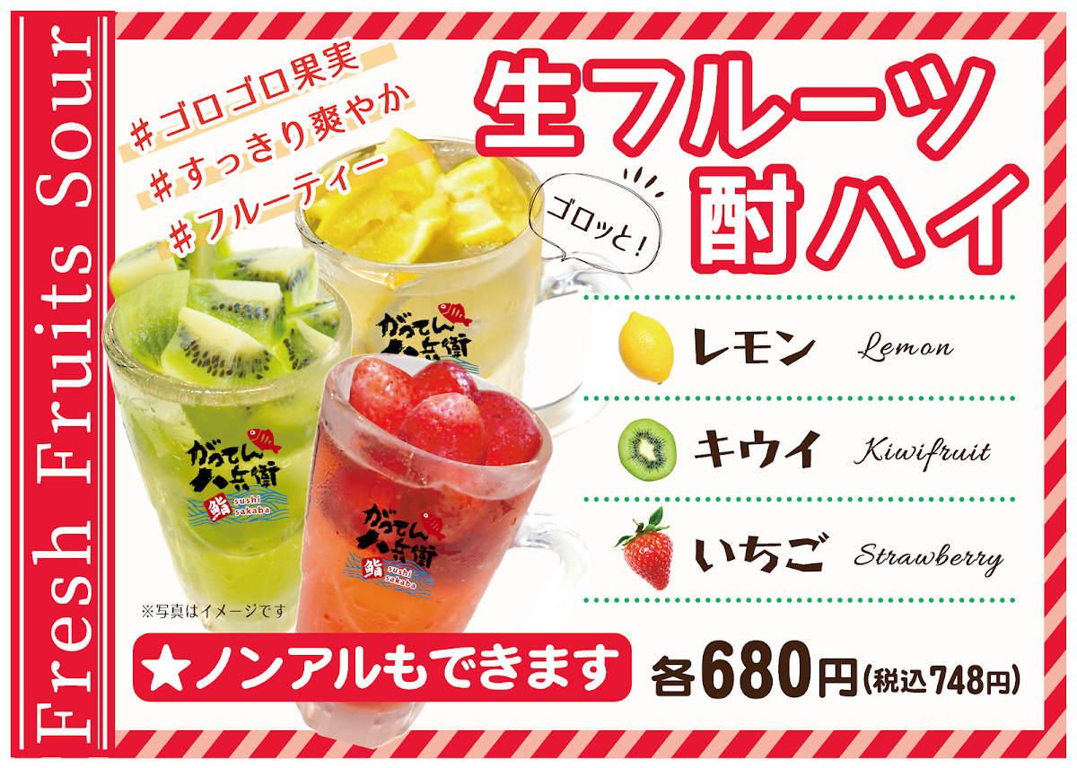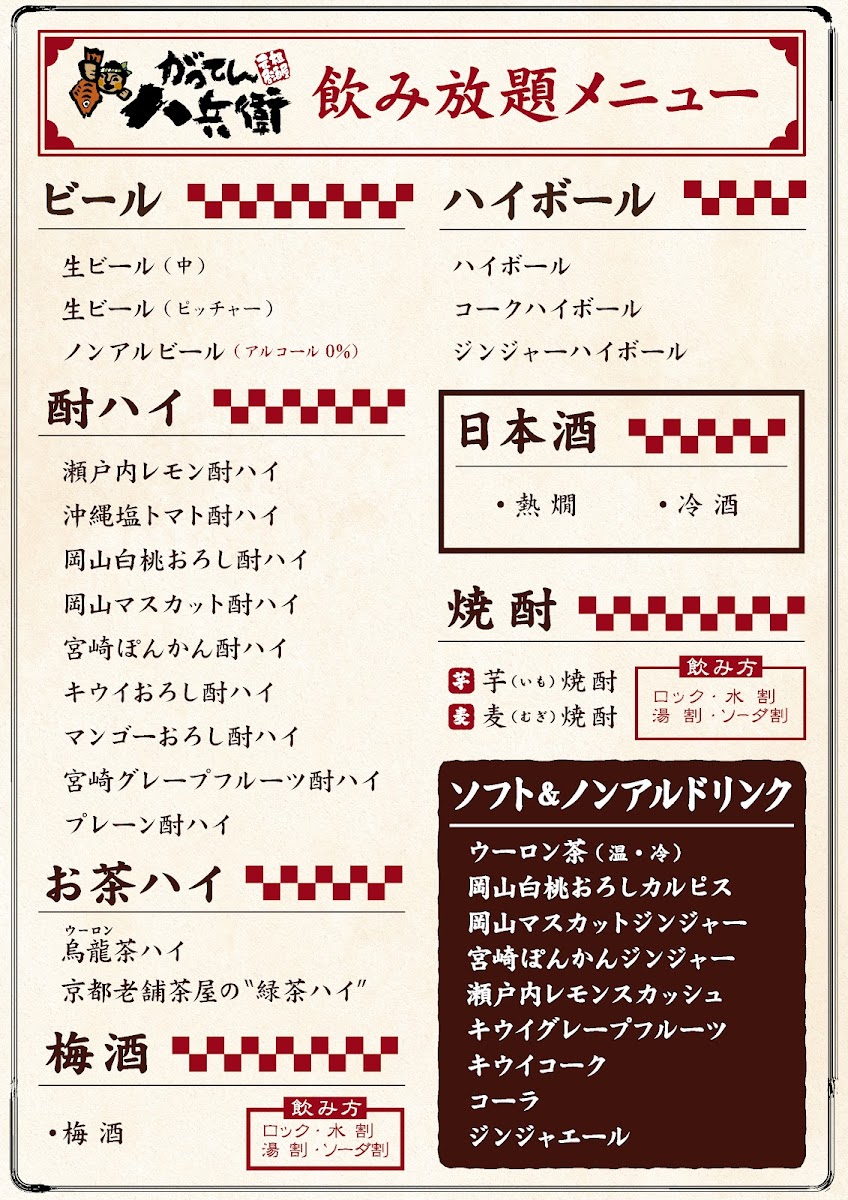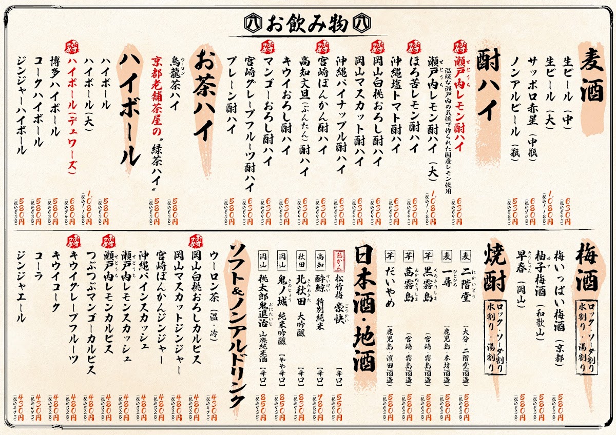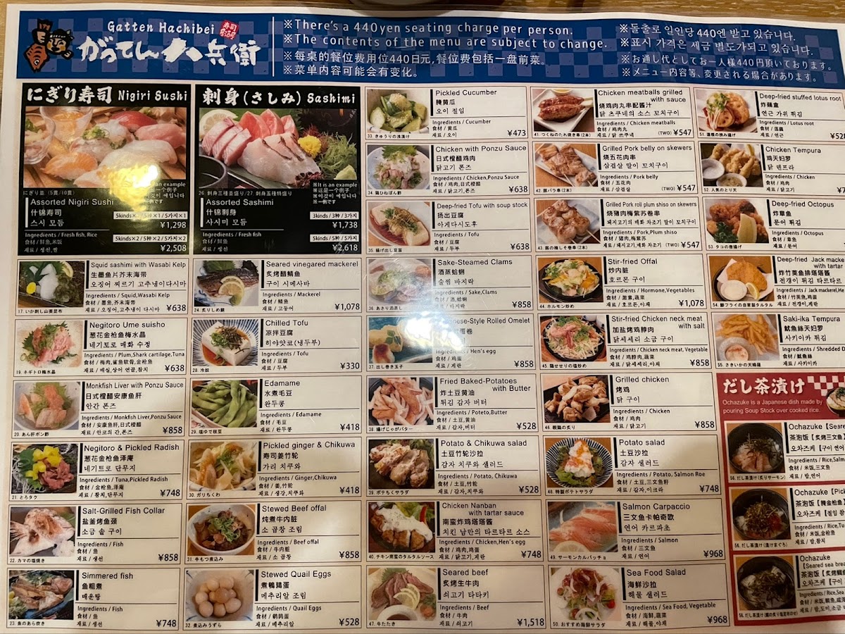 The menu at Seafood Izakaya Gatten Hachibe offers a delightful variety of dishes that showcase the best of Japan's seafood and meat offerings. Highlights include Ikasashi (whole squid sashimi) and Hiroshima oysters fried with both tartar and sauce-both quintessential items reflecting the quality of fresh seafood. For those looking to try something unique, there's Matsusaka beef sushi paired with Okayama peach pork demi katsu. The restaurant also serves different set menus with prices that include all-you-can-drink options for 120 minutes. The sets range from ¥7,000 (tax included) for 8 items, featuring 3 types of fresh fish nigiri and Okayama peach pork steak, to the more affordable ¥4,000 (tax included), which offers fried chicken and soft braised pork fried rice among its 8 items. Additionally, there is a selection of skewers starting from a single order, including chicken thigh. Whether you’re in the mood for sushi, fried food, or grilled skewers, the menu provides an extensive and satisfying experience, perfect for a casual yet flavorful dining experience in Okayama.